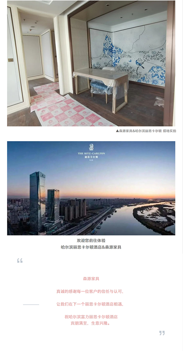 十分感謝富力集團&哈爾濱麗思卡爾頓酒店,森源家具有幸承接了酒店核心版塊:首三層所有公共區域包含到達大堂、所有ES行政套房、五十三層行政酒廊、五十四層空中大堂和空中酒廊區、三十七層泳池及健身房區等**定制家具。